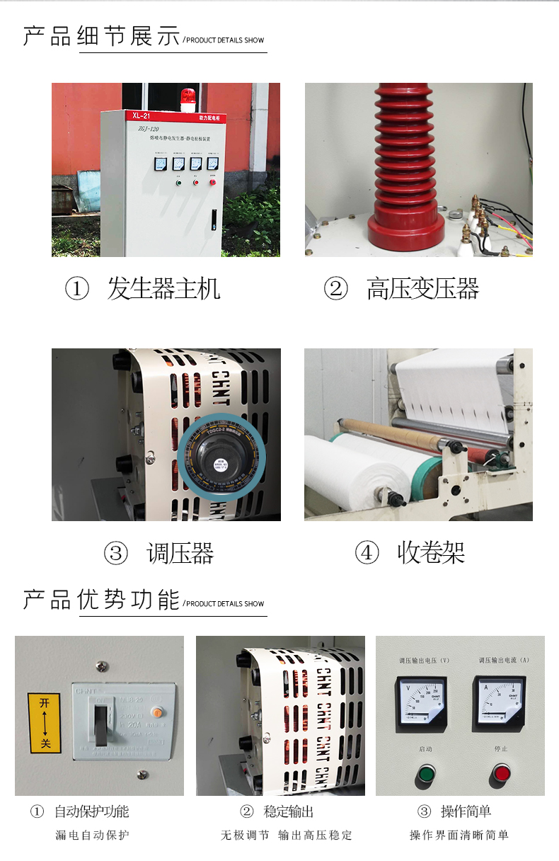 本設(shè)備是專為熔噴無紡布過濾材料提高過濾效率而設(shè)計的處理設(shè)備,由三部分組成:發(fā)生器主機(jī)、升壓變壓器。